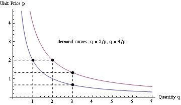 Similarly, to achieve a quantity demanded of 3 units, a unit price of 2/3 is needed with the inner demand curve, but a unit price of 4/3 is needed with the outer demand curve.